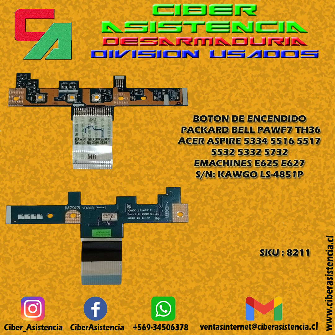 BOTON DE ENCENDIDO PACKARD BELL PAWF7 TH36 ACER ASPIRE 5334 5516 5517 5532 5332 5732 EMACHINES E625 E627 S/N: KAWGO LS-4851P
